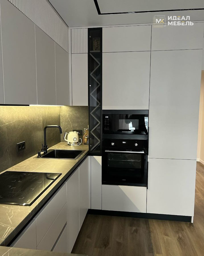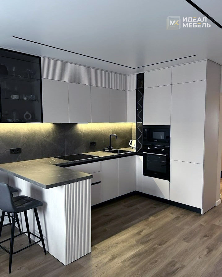 П-образная серо-белая кухня без ручек в ЖК Минск Мир №1