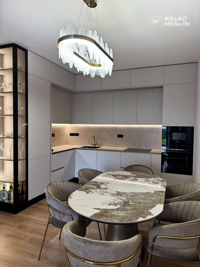 Островная серо-белая кухня в стиле модерн в ЖК Маяк Минска №14