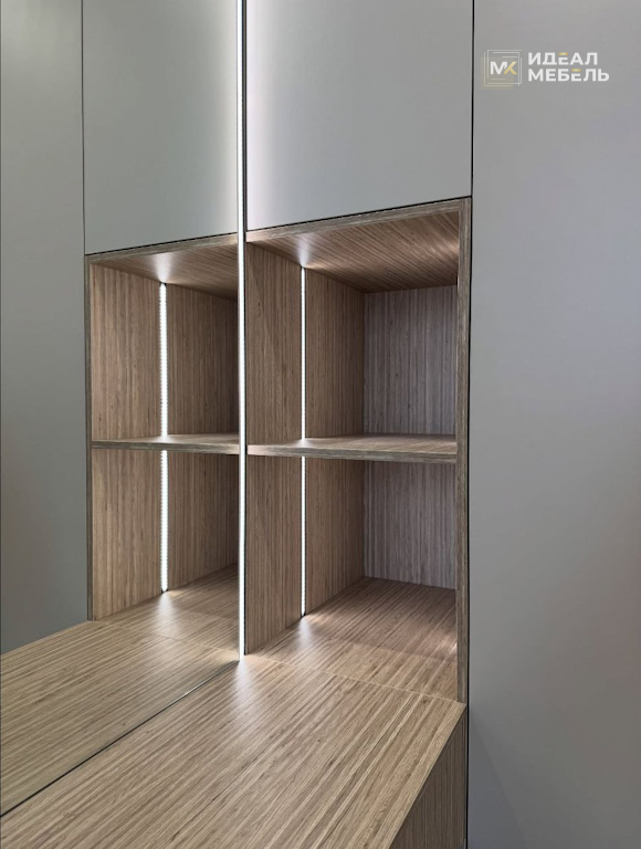 Распашной шкаф с декоративными нишами и подсветкой встроенный во всю стену №29