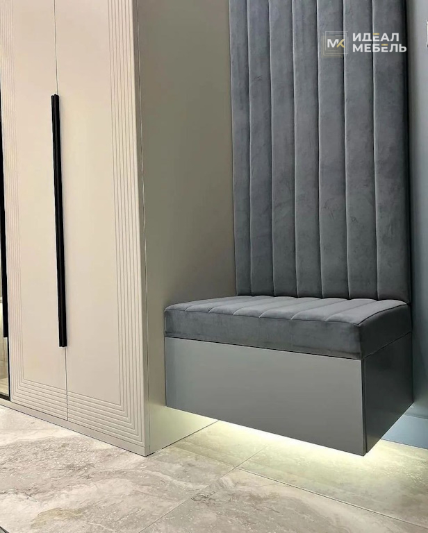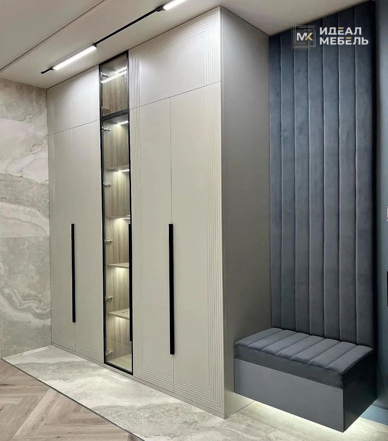 Распашной 4-х дв. шкаф-витрина с парящей тумбой и мягкой панелью №13