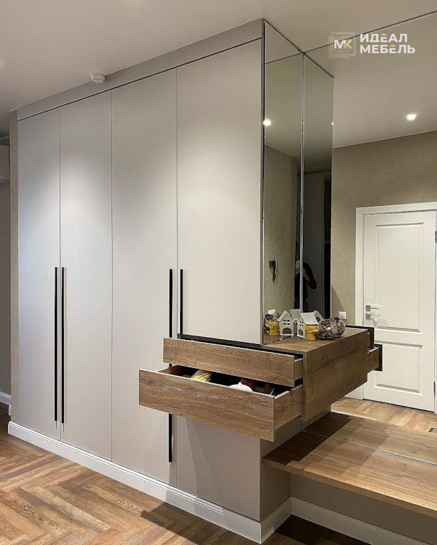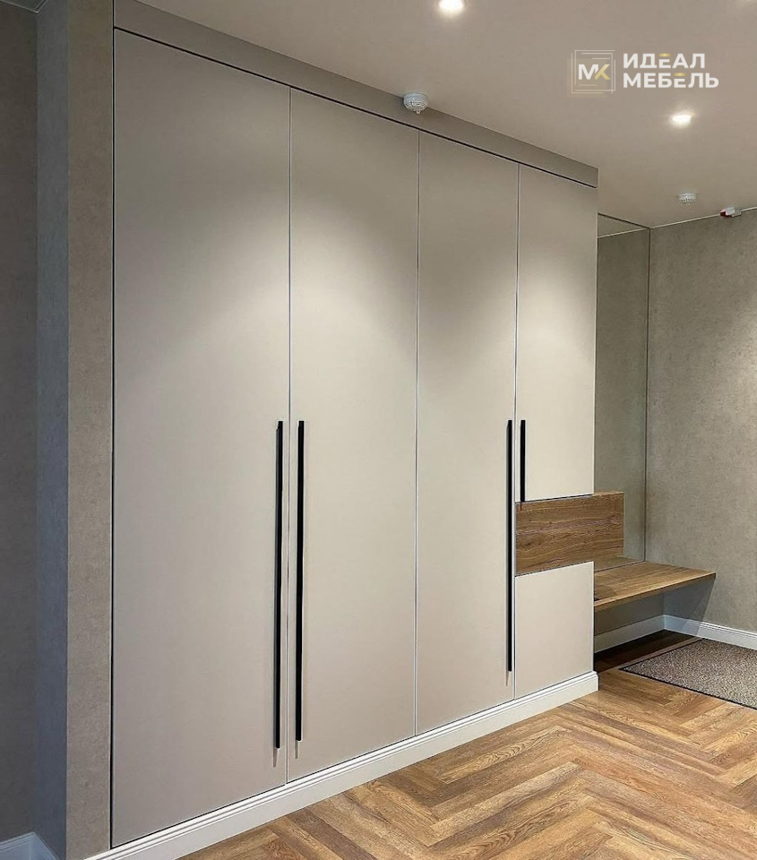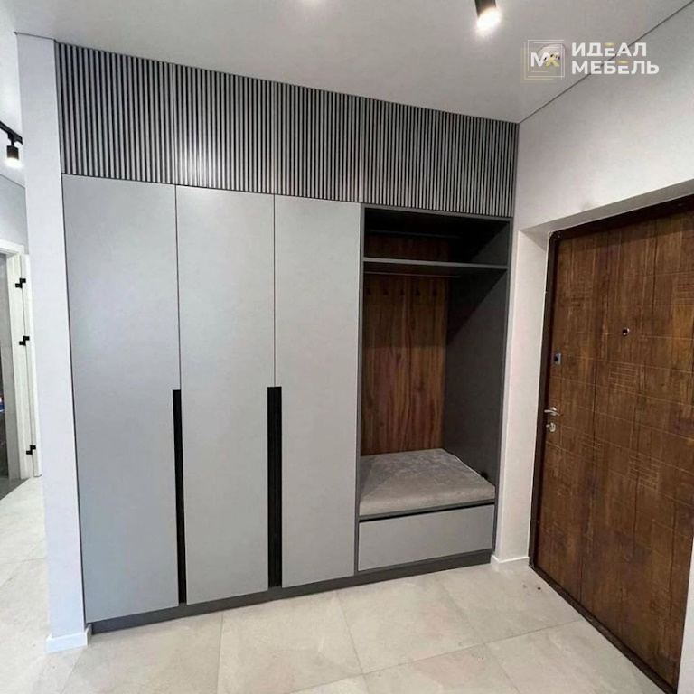 Встроенный трехдверный шкаф с антресолями, вешалкой, тумбой и мягким сиденьем №17