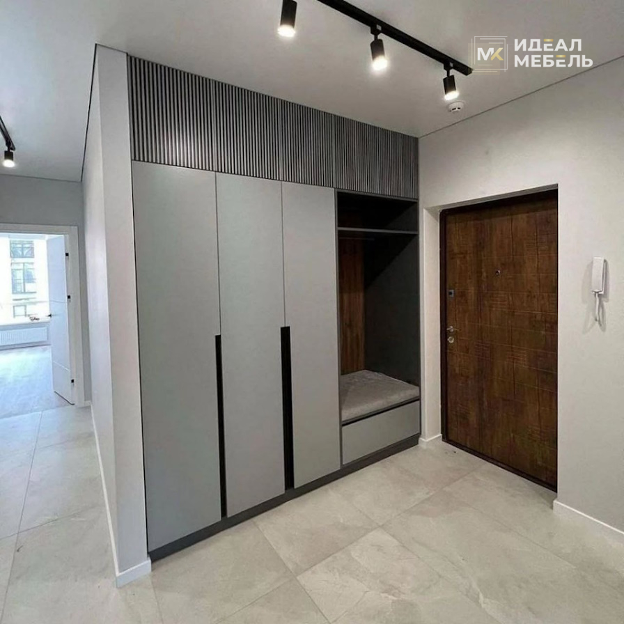 Встроенный стильный шкаф с серыми матовыми фасадами и вертикальными ручками №23