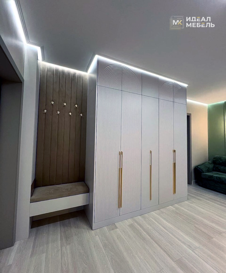 Особое внимание привлекает мягкая панель — она не только создаёт уютную атмосферу, но и обеспечивает дополнительный комфорт в повседневном использовании, превращая прихожую в продуманное и гостеприимное пространство.