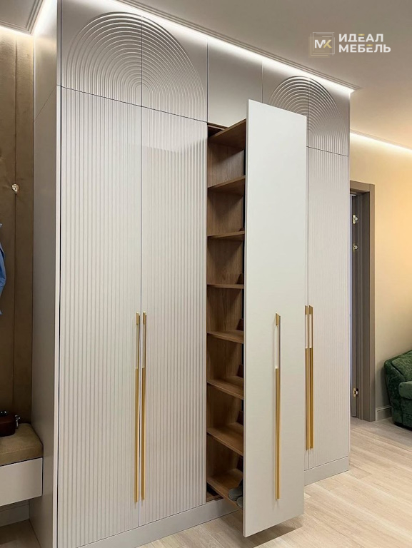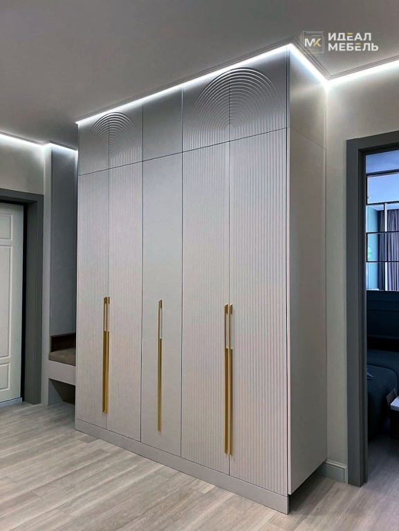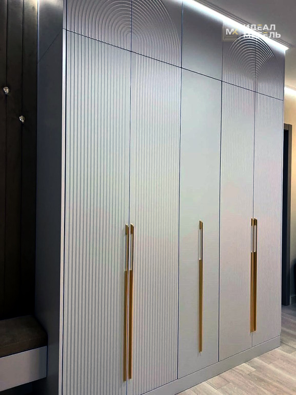 Фасады выполнены из крашеного МДФ с изящным рифлёным декором, который придаёт мебели выразительную фактуру и подчёркивает современный характер интерьера. Вертикальные золотые ручки добавляют акцент роскоши и визуально вытягивают силуэт шкафа, делая его ещё более утончённым.