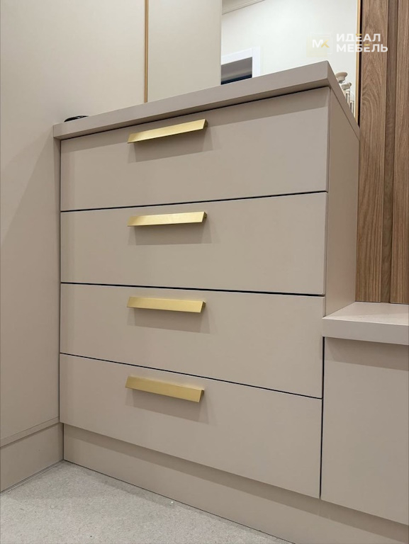 Лаконичный дизайн в тёплой цветовой гамме создаёт уютную атмосферу, а изящные золотые ручки добавляют акцент элегантности и визуальной лёгкости. Шкаф гармонично вписывается в интерьер, сочетая в себе эстетику и практичность.