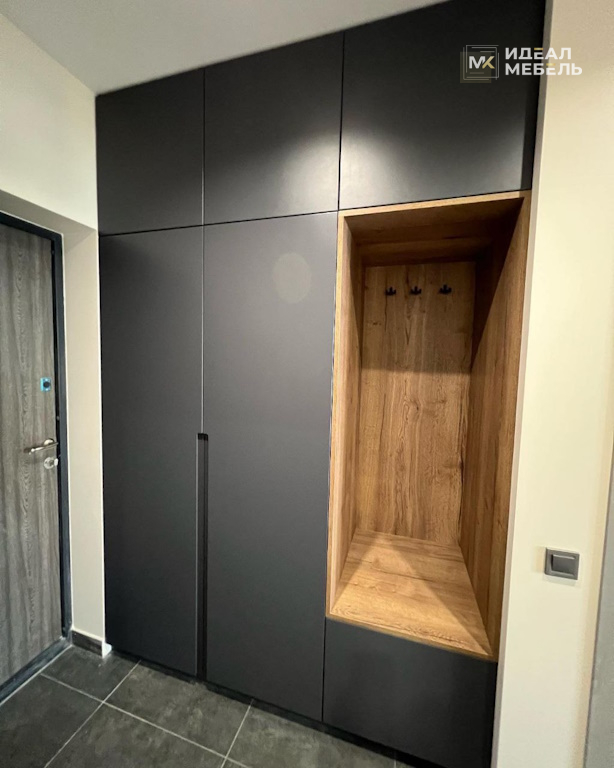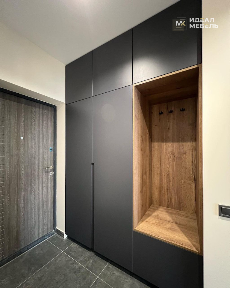 Конструкция во всю стену позволяет максимально использовать пространство для хранения: удобно разместить верхнюю одежду, обувь и аксессуары, сохраняя порядок в зоне прихожей.