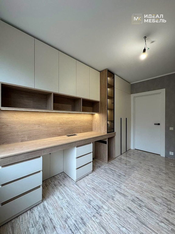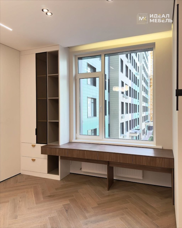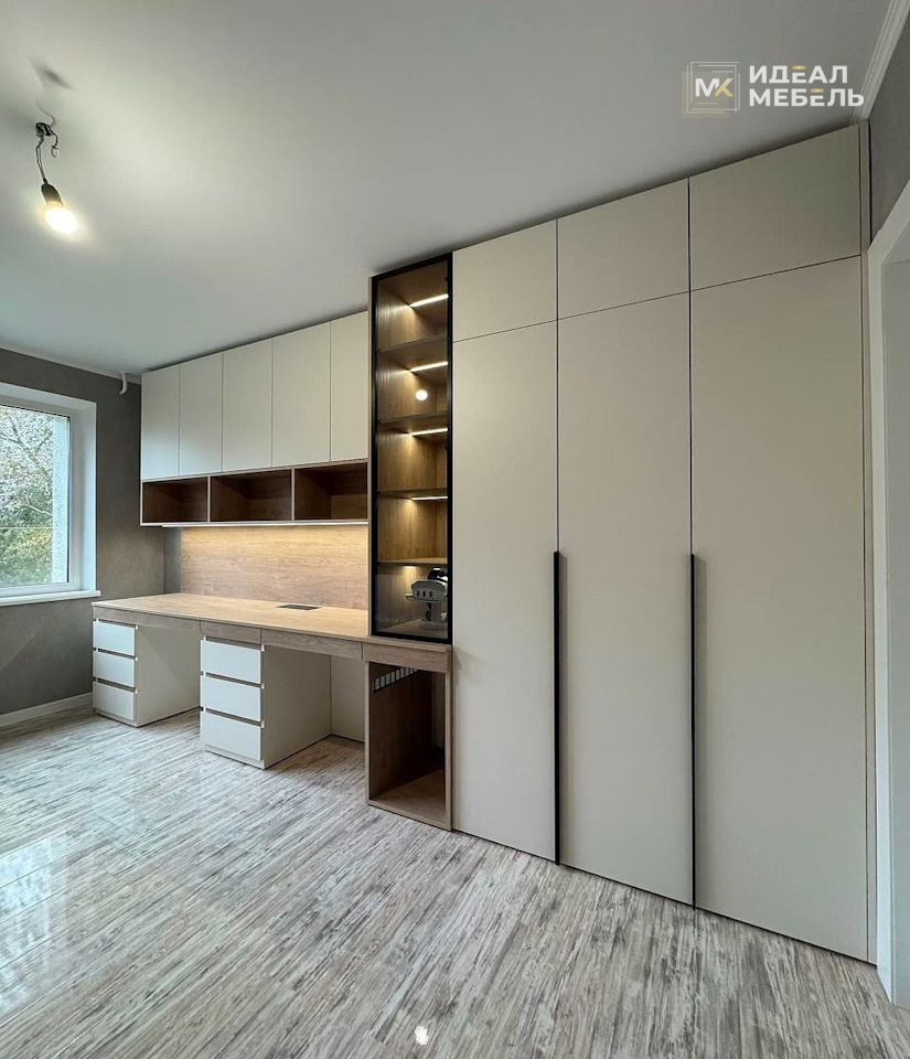 Справа от рабочей зоны мы разместили функциональную систему хранения. Она объединяет несколько типов хранения. Открытые полки подойдут для книг, декора или часто используемых предметов. За распашными дверцами скрывается вместительное пространство для одежды и крупногабаритных вещей. Выдвижные ящики помогут аккуратно сортировать мелочи. Такое разнообразие позволяет гибко организовать пространство под индивидуальные потребности подростка. Здесь найдется место и для школьных принадлежностей, и для личных коллекций, и для гардероба.