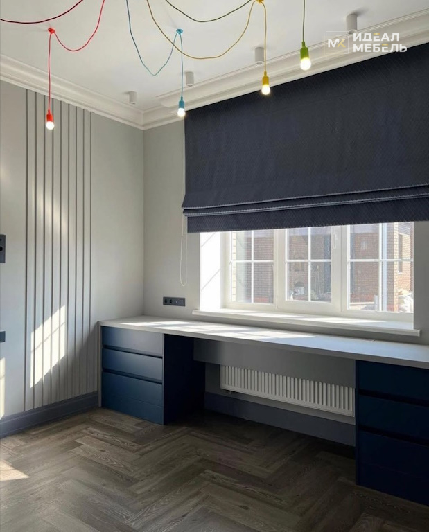 Центральное место в комнате занимает широкая рабочая зона у окна. Она обеспечивает максимальное естественное освещение. Это особенно важно для учебы, чтения и творческих занятий. По обеим сторонам рабочей зоны стоят две тумбы с выдвижными ящиками. Они служат надежной опорой для столешницы. Также они предоставляют удобное хранение для канцелярии, документов и личных вещей. Все необходимое находится в зоне доступа. При этом вещи не загромождают рабочую поверхность.