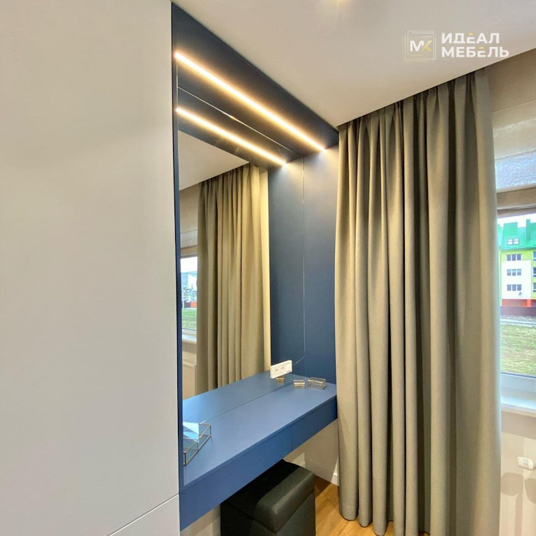 Завершает композицию подвесной туалетный столик с зеркалом. Такое решение визуально облегчает конструкцию, не загромождая пол, и создает удобную зону для сборов. Столик органично интегрирован в общую структуру шкафа, формируя единое, гармоничное пространство, где функциональность встречается с продуманной эстетикой.