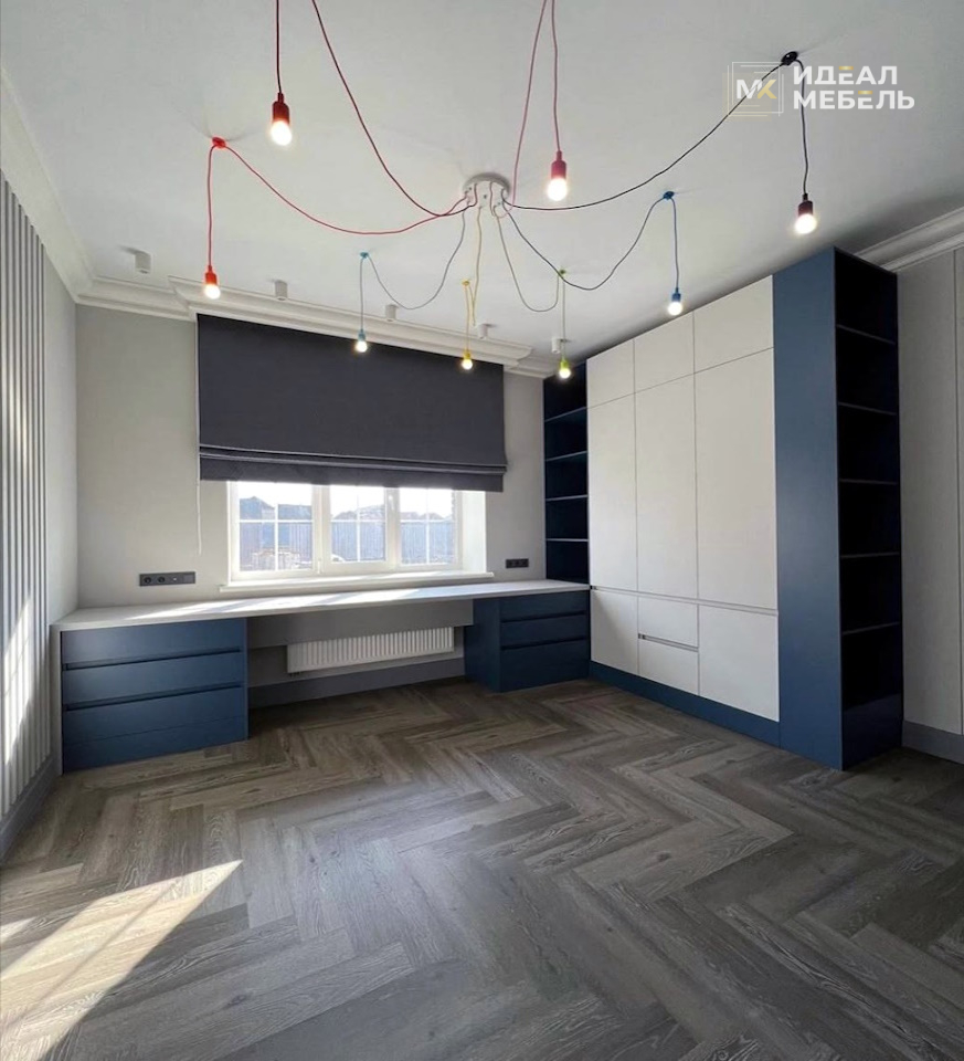 Этот школьный уголок, расположенный у окна, — продуманное решение для организации учебного пространства, где естественное освещение играет ключевую роль. Широкий стол, установленный вдоль окна, обеспечивает максимальную рабочую поверхность: здесь удобно разместить учебники, тетради, компьютер и все необходимые принадлежности, не загромождая пространство. Расположение у окна дает ребенку качественное дневное освещение, что особенно важно для сохранения зрения и продуктивной учебы.