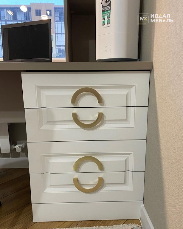 Справа под столом расположена тумба с выдвижными ящиками. Это удобное место для хранения канцелярии, рабочих материалов и личных вещей: все необходимое находится под рукой, но при этом не занимает полезную поверхность стола. Выдвижная система позволяет быстро найти нужный предмет и так же быстро убрать его на место, приучая ребенка к организованности.