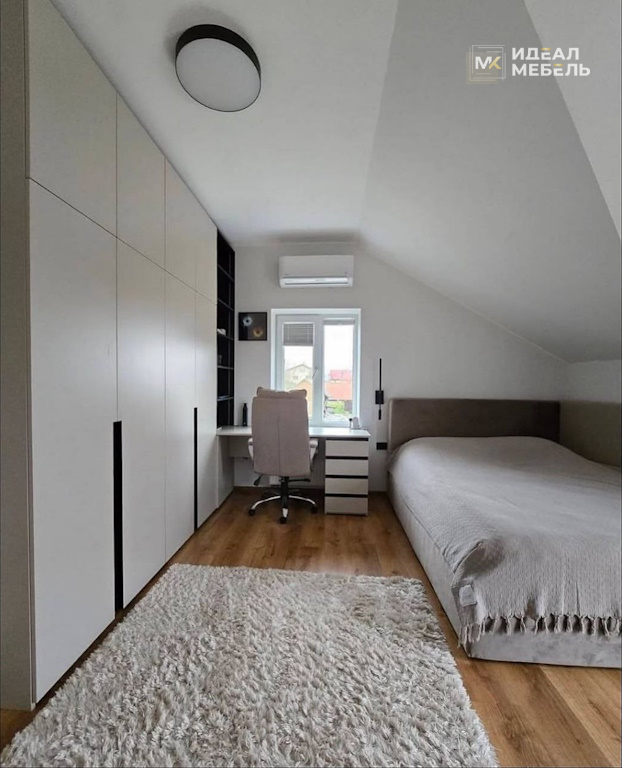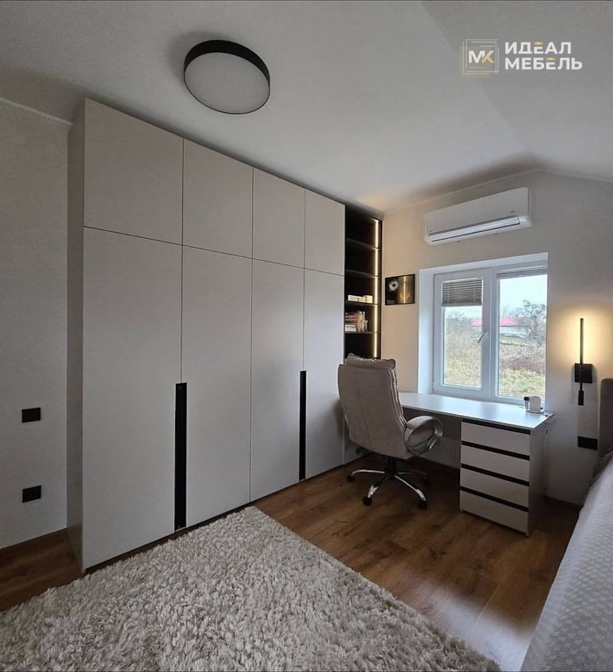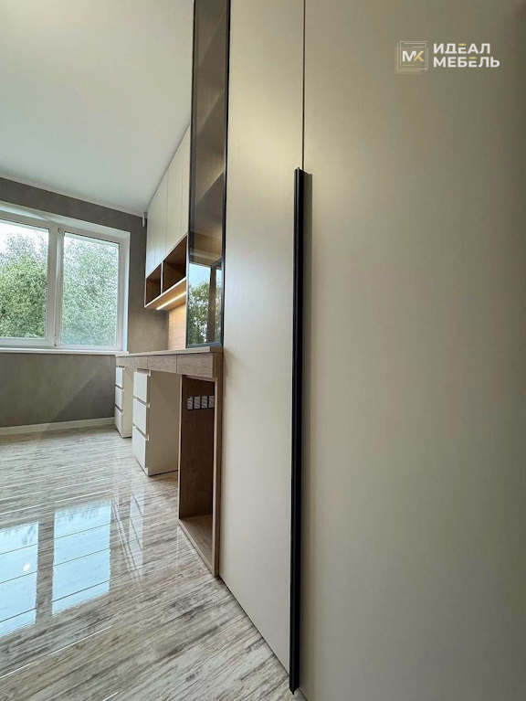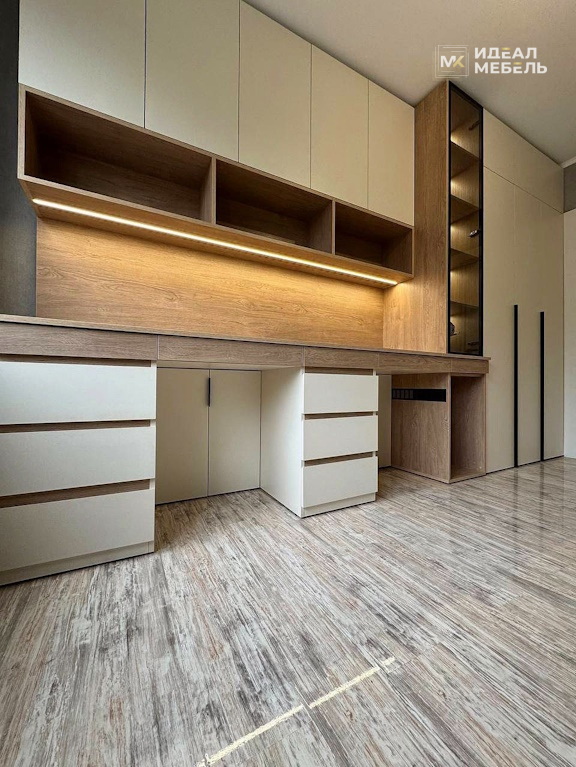 Система объединяет хранение и рабочие зоны в одной продуманной композиции, обеспечивая комфорт, порядок и современный эстетичный вид комнаты.