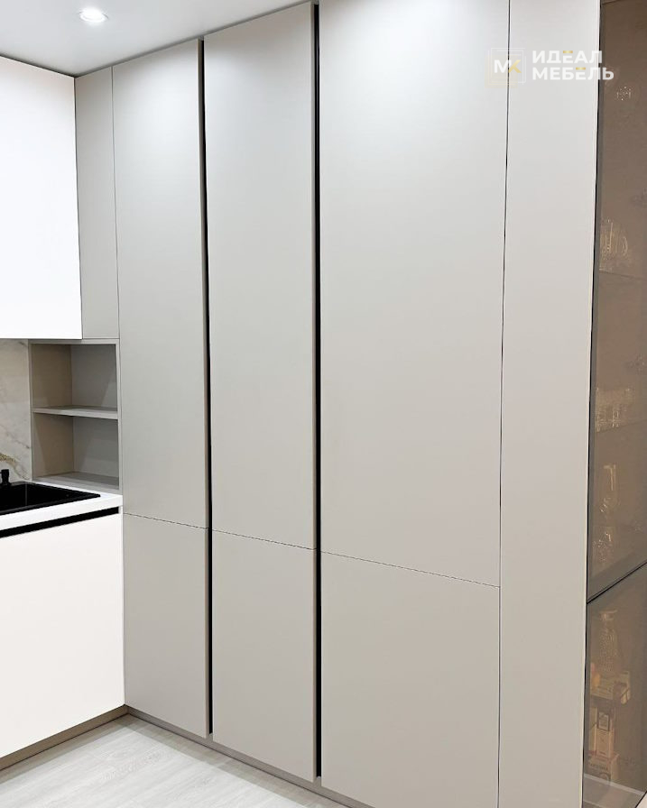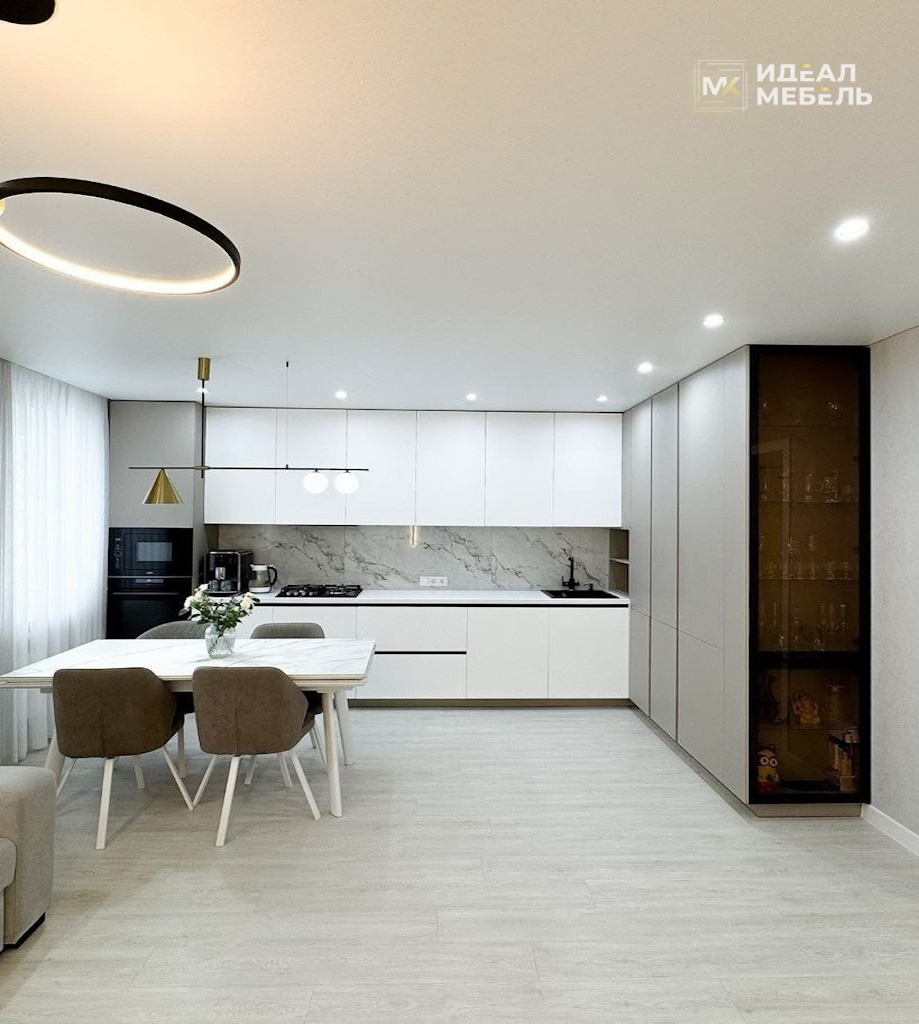 Торцевая стеклянная витрина для посуды с подсветкой придаёт кухне элегантность и позволяет красиво разместить бокалы, сервизы или декоративные аксессуары. Фасады выполнены без ручек и открываются за край, что подчеркивает минимализм и лаконичность дизайна. Светлая цветовая палитра визуально увеличивает пространство, делая его более уютным и гармоничным.