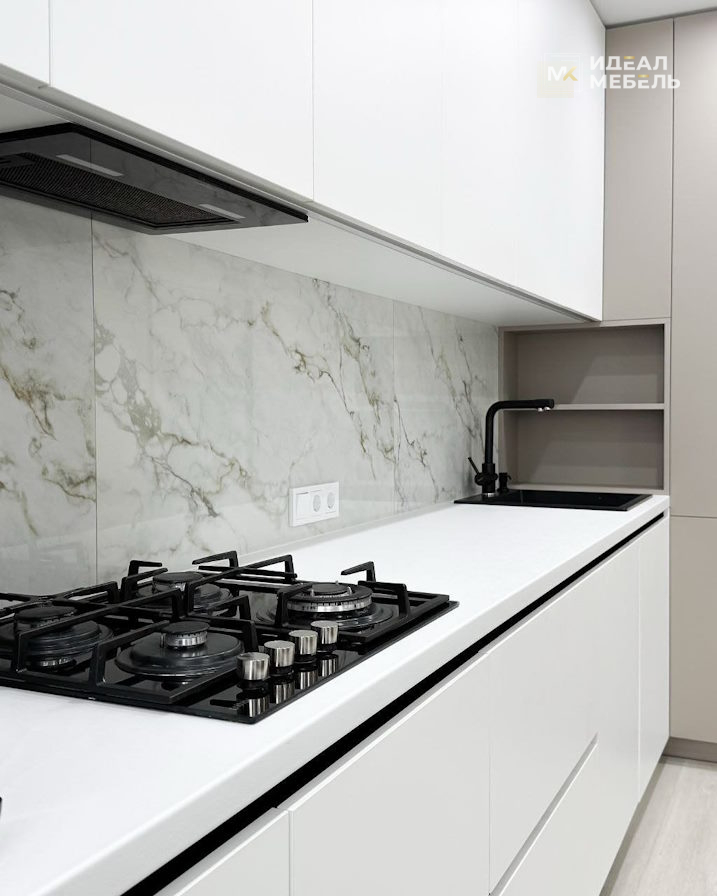 Эта угловая кухня идеально подойдёт для квартир и домов с современными интерьерами, где важны не только стиль, но и практичность. Она сочетает в себе удобство ежедневного использования, долговечные материалы и современные решения хранения.