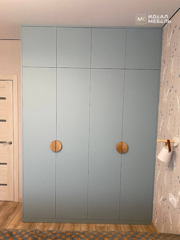 Светло-голубой четырехдверный распашной шкаф — спокойное и аккуратное решение для интерьера с мягкой цветовой палитрой.