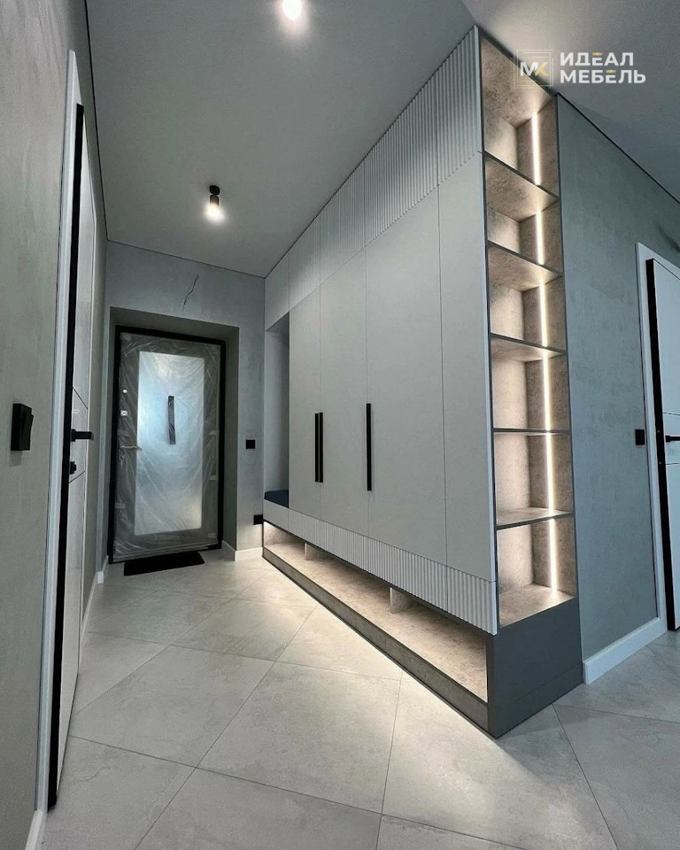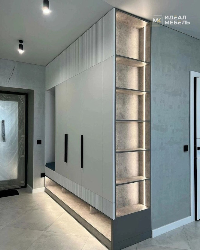 Шкаф для прихожей во всю стену с торцевым стеллажом и нишами для обуви №19