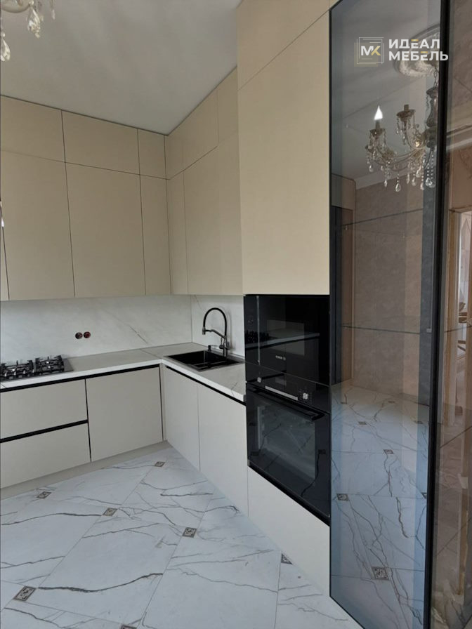 Угловая современная кухня без ручек — это воплощение функциональности и эстетики в одном пространстве. Гарнитур выполнен с кремовыми матовыми фасадами из прочного пластика, которые отличаются устойчивостью к влаге, загрязнениям и легкостью в уходе.
