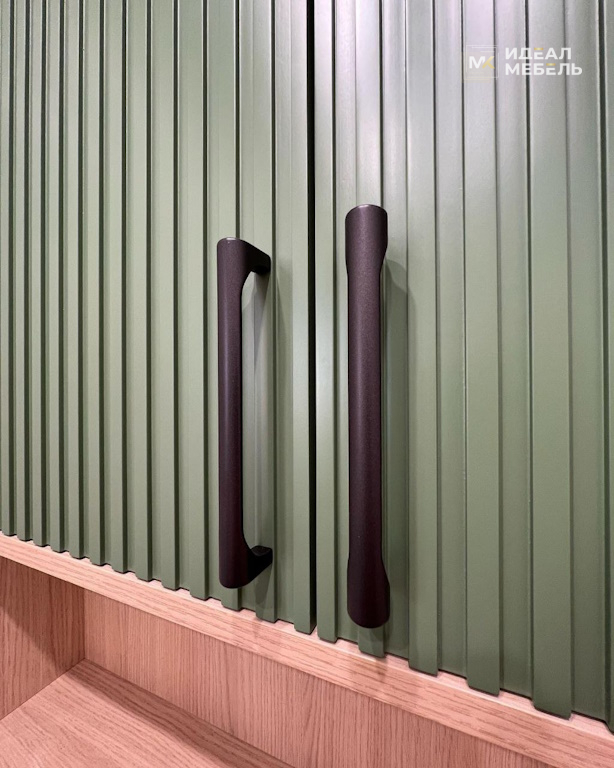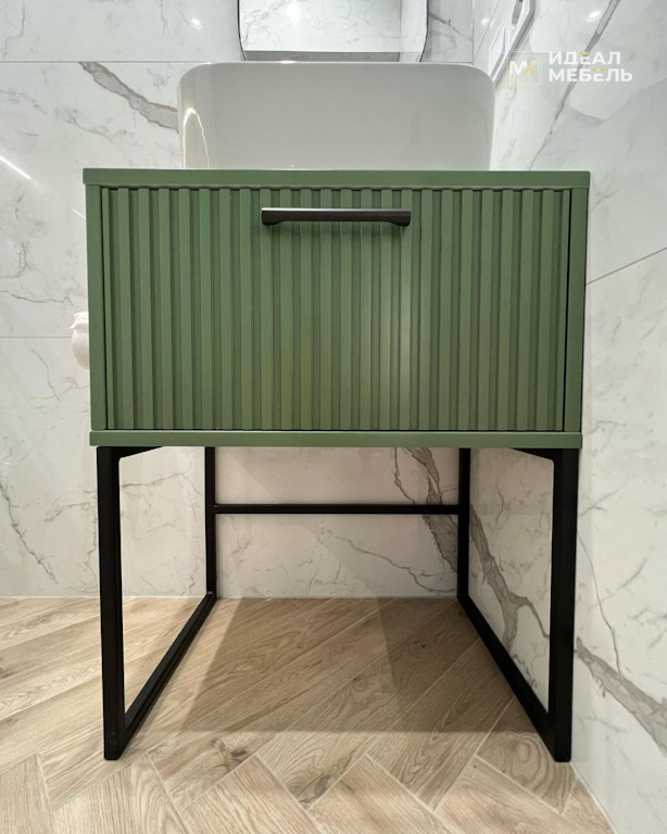 Этот комплект мебели для ванной комнаты объединяет в себе элегантный дизайн и продуманную функциональность. Фасады выполнены из крашеного МДФ с 3D фрезеровкой «вельвет». Глубокая зеленая окраска придает интерьеру благородство и характер, а объемная текстура фасадов создает сложную игру света и тени, превращая утилитарное пространство в помещение с выраженным стилем.