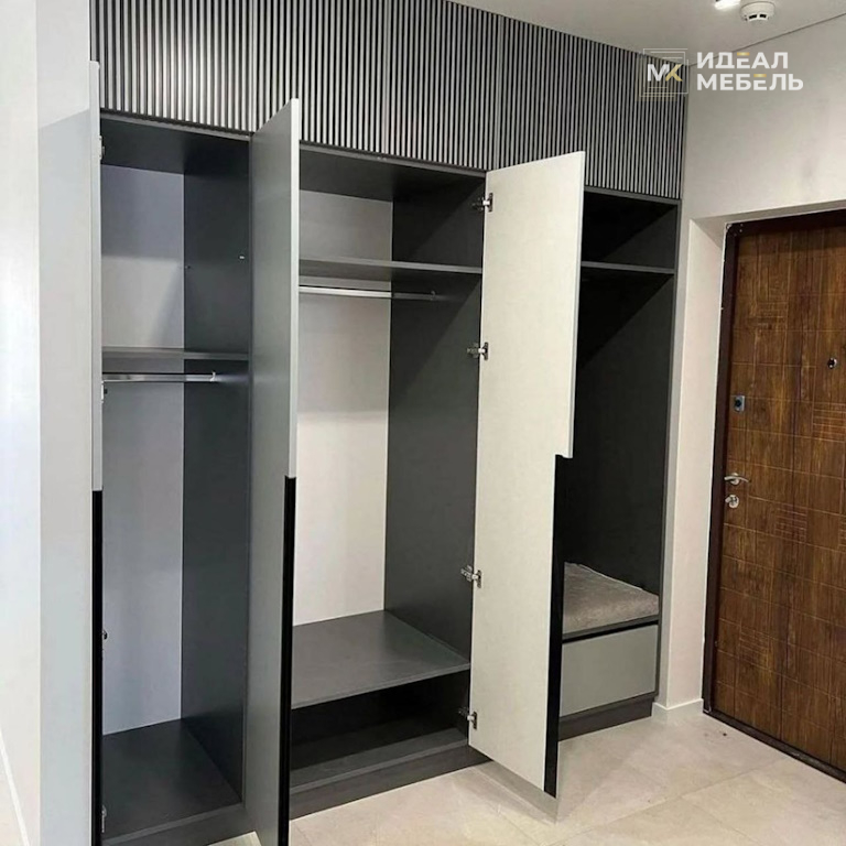 Шкаф объединяет несколько функциональных зон: вместительное хранение за распашными фасадами, антресоли для сезонных вещей и отдельную секцию с вешалкой для верхней одежды. Такое разделение позволяет удобно распределить повседневные и редко используемые вещи.